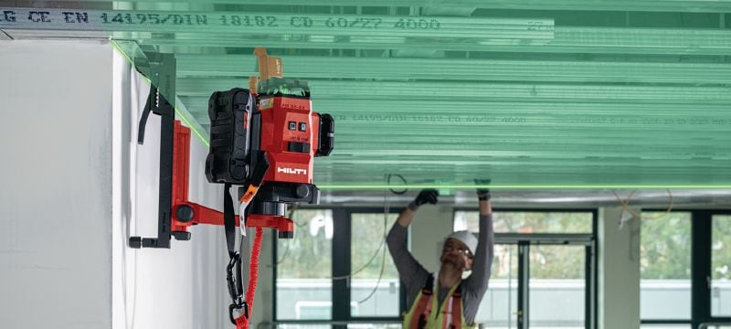 - Tre 360° laserplan (ett horisontellt och två vertikala) för avvägning, inriktning, vinkelpositionering och lodning med en enda inställningspunkt